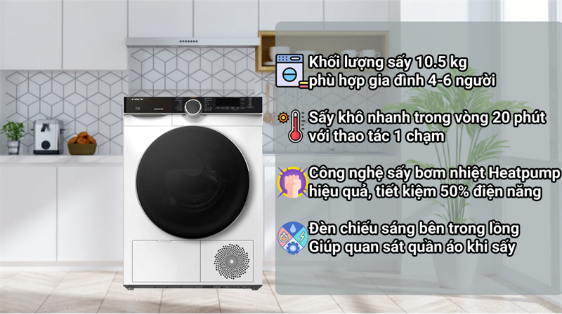 Quần áo được sấy khô nhanh chóng, sấy khô hiệu quả, tiết kiệm 50% điện năng nhờ công nghệ sấy bơm nhiệt Heatpump. Điểm cộng của Coex CD-10HPB là được tích hợp nhiều công nghệ hiện đại có thể kể đến như công nghệ Inverter tiết kiệm điện, hoạt động bền bỉ; công nghệ Hygiene và công nghệ Tumble Dryer cảm biến độ ẩm ẩm hạn chế sấy khô quần áo quá mức; đảo chiều sấy giúp chống nhăn, tiết kiệm thời gian là ủi.