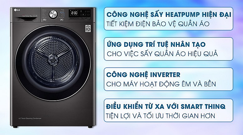 Bạn cũng không cần phải quá lo lắng với hóa đơn tiền điện mỗi tháng của gia đình khi thiết bị có khả năng tiết kiệm điện hiệu quả nhờ công nghệ Inverter. Tính năng Smart ThinQ được kết nối với chiếc điện thoại thông minh, giúp bạn điều khiển máy sấy từ xa vô cùng tiện lợi.