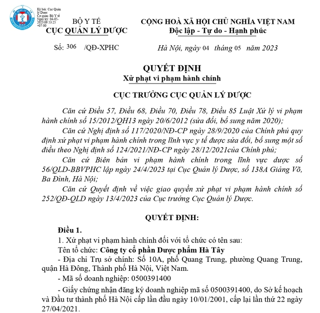 | Quyết định số 306/QĐ-XPHC về việc xử phạt vi phạm hành chính Công ty cổ phần Dược phẩm Hà Tây với tổng số tiền là 115 triệu đồng. |