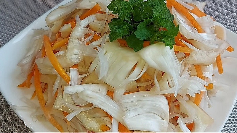 Mít non muối chua sau khi ngâm đủ thời gian có thể cho ra đĩa và thưởng thức rồi. Từng miếng mít non trắng tinh tươm, dai dai, giòn giòn trộn lẫn với cà rốt tạo thành một món ăn bắt mắt, hương vị chua chua, ngọt ngọt, mằn mặn vô cùng độc đáo.