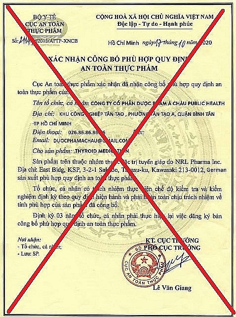 Trên cơ sở công văn trả lời của Cơ quan cảnh sát điều tra Công an Quận Tân Bình - Thành phố Hồ Chí Minh, Cục An toàn thực phẩm cảnh báo về việc Giấy xác nhận công bố phù hợp quy định an toàn thực phẩm của sản phẩm Thyroid Medication nêu trên là giả mạo.