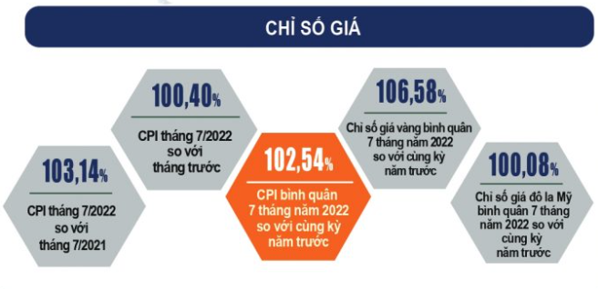 Tổng cục Thống kê chỉ ra, một số nguyên nhân làm tăng CPI trong 7 tháng năm 2022 như: trong 7 tháng năm nay, giá xăng dầu được điều chỉnh 19 đợt; trong đó, có 6 đợt giảm giá, làm cho giá xăng A95 tăng 2.780 đồng/lít; xăng E5 tăng 2.520 đồng/lít và dầu diezen tăng 7.280 đồng/lít. Bình quân 7 tháng, giá xăng dầu trong nước tăng 49,75% so với cùng kỳ năm trước, tác động làm CPI chung tăng 1,79 điểm phần trăm.