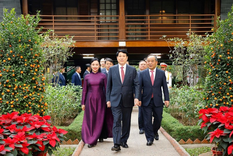 Chúc Tết và nói chuyện thân mật với cán bộ, nhân viên Khu di tích, Chủ tịch nước đề nghị, trong năm mới, Khu di tích cần tiếp tục phát huy vai trò quan trọng của mình, hết lòng, hết sức gìn giữ những tài liệu, hiện vật quý giá của Chủ tịch Hồ Chí Minh, để chúng trở thành nguồn tài sản tinh thần vô giá cho thế hệ hôm nay và mai sau, để Khu di tích luôn là “địa chỉ đỏ” thiêng liêng, nơi truyền tải những giá trị lịch sử, tư tưởng, đạo đức và phong cách Hồ Chí Minh không chỉ đối với nhân dân Việt Nam mà còn đối với bạn bè khắp năm châu.