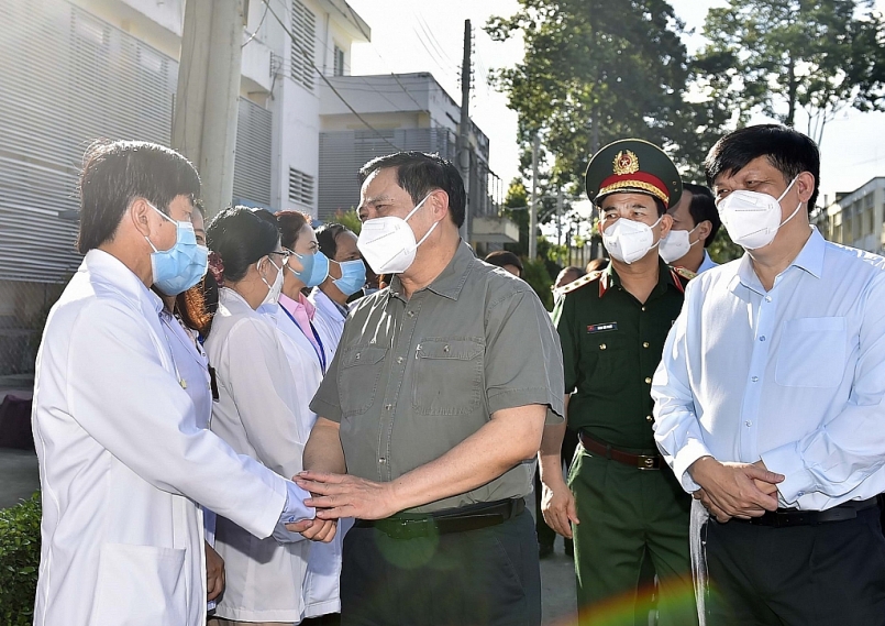 | Thủ tướng động viên đội ngũ cán bộ y, bác sĩ cả nước nói chung đang ngày đêm chiến đấu bảo vệ sức khỏe người dân. Trong ảnh: Thủ tướng thăm đội ngũ cán bộ y, bác sĩ BV đa khoa tỉnh Bình Dương, ngày 27/6 |