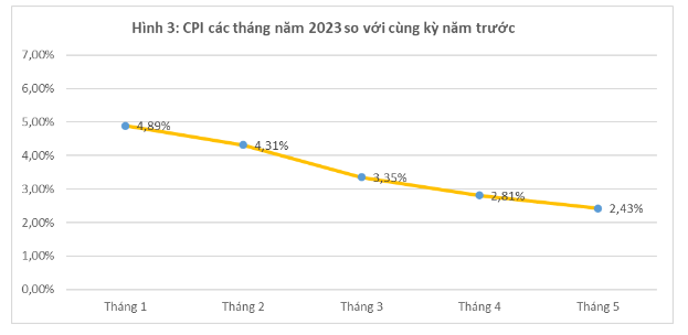 Tổng cục Thống kê cũng chỉ ra chỉ số giá tiêu dùng các tháng từ đầu năm đến nay so với cùng kỳ năm trước có xu hướng giảm dần; trong đó, CPI tháng 1/2023 tăng cao nhất với 4,89%, tháng 2/2023 tăng 4,31%, tháng 3/2023 tăng 3,35%, tháng 4/2023 tăng 2,81% và đến tháng 5/2023 mức tăng còn 2,43%.