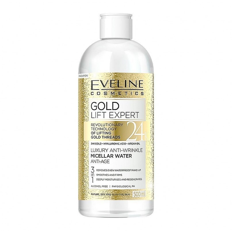 Nước tẩy trang Eveline Gold Lift Expert chống nhăn da 3 tác động 500ML giúp loại bỏ lớp trang điểm không tan trong nước, giúp da mịn màng và săn chắc, dưỡng ẩm sâu. Nghiên cứu cho thấy tinh chất vàng 24k có khả năng chống lão hóa hiệu quả, giúp làm chậm sự suy giảm collagen, tăng độ đàn hồi của da, làm sáng da, kích thích các tế bào làm cho da săn chắc và ngăn ngừa lão hóa sớm, chống nhăn hiệu quả. Hyaluronic Acid giúp cung cấp độ ẩm cho da mềm mại, ngăn ngừa lão hóa và giảm nếp nhăn trên da. Tinh dầu Arrgan, D-panthenol và Allantoin giúp cải thiện độ mịn màng, làm dịu kích ứng và ngăn ngừa khô da, căng da. Giá: 276.000 đồng |