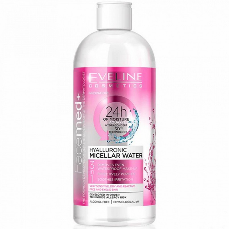Nước tẩy trang Eveline Facemed+ dưỡng ẩm Hyaluronic 400ML không chứa paraben, không cồn với công thức tẩy trang nhẹ nhàng lấy đi lớp trang điểm, bụi bẩn và lượng dầu nhờn bám trên da. Hoạt chất Hyaluronic, D-Panthenol và chiết xuất dưa leo, pH trung tính giúp phục hồi làn da sạch mịn, tươi sáng. Giá: 270.000 đồng |