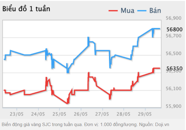 Chốt phiên giao dịch cuối tuần 29/5, giá vàng miếng trong nước được Tập Đoàn Vàng bạc đá quý Doji niêm yết ở mức: 56,3 triệu đồng/lượng (mua vào) và 56,7 triệu đồng/lượng (bán ra), tăng 50 nghìn đồng chiều mua vào so với ngày hôm qua.