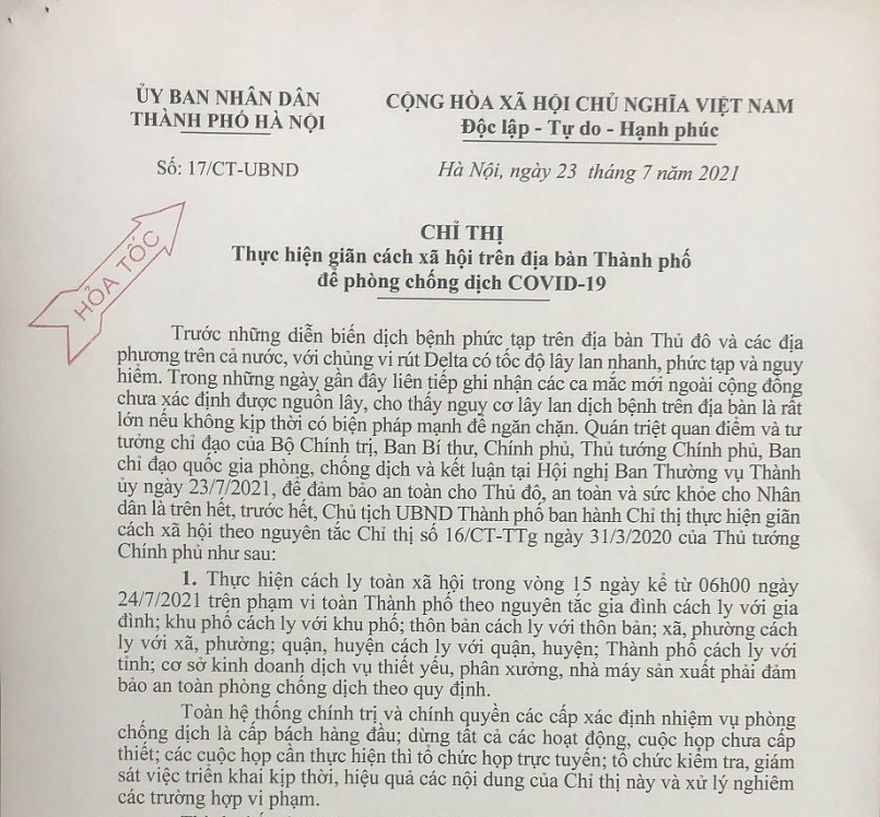 Tối 23/7/2021, Chủ tịch UBND thành phố Hà Nội Chu Ngọc Anh đã ra Chỉ thị 17CT-UBND về việc Thực hiện giãn cách xã hội trên địa bàn Thành phố để phòng chống dịch COVID-19.