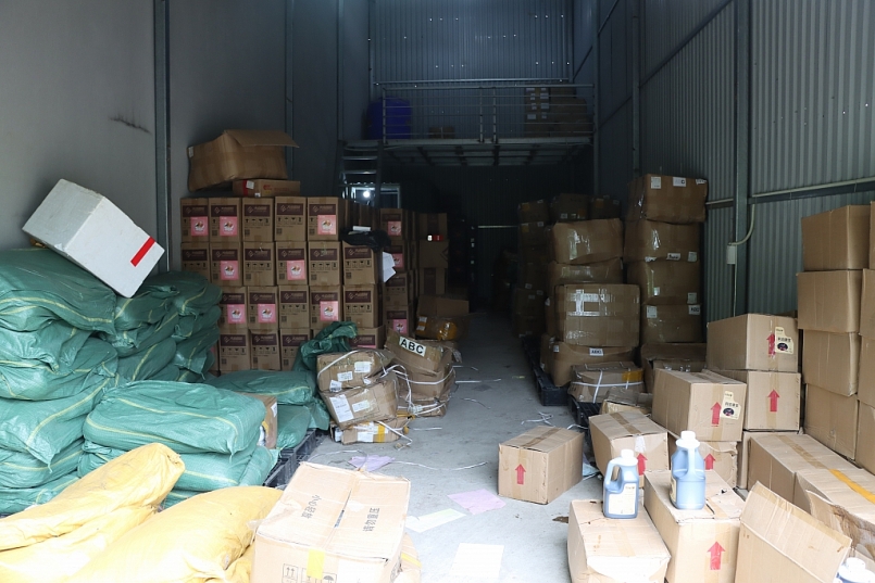 Theo quan sát, hàng hoá tại cơ sở kinh doanh và 3 kho hàng được đóng trong các thùng carton và bao tải dứa màu xanh. Nhiều thùng hàng đã bị bật tung, ẩm mốc, hàng đổ vương vãi. Đáng chú ý, dưới nền các kho hàng là ngổn ngang rác và các tệp giấy in nhãn phụ.