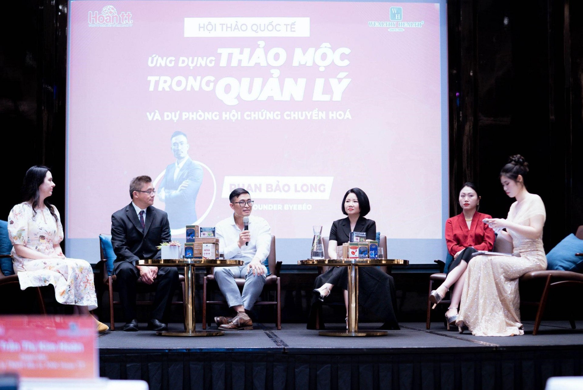| Bà Trần Thị Kim Hoàn - GĐ công ty Hoan TT (thứ ba từ phải qua), nhãn hàng Wealthy Health, chuyên gia và các đối tác trong buổi tọa đàm “Ứng dụng thảo mộc trong quản lý và dự phòng hội chứng chuyển hóa”. |