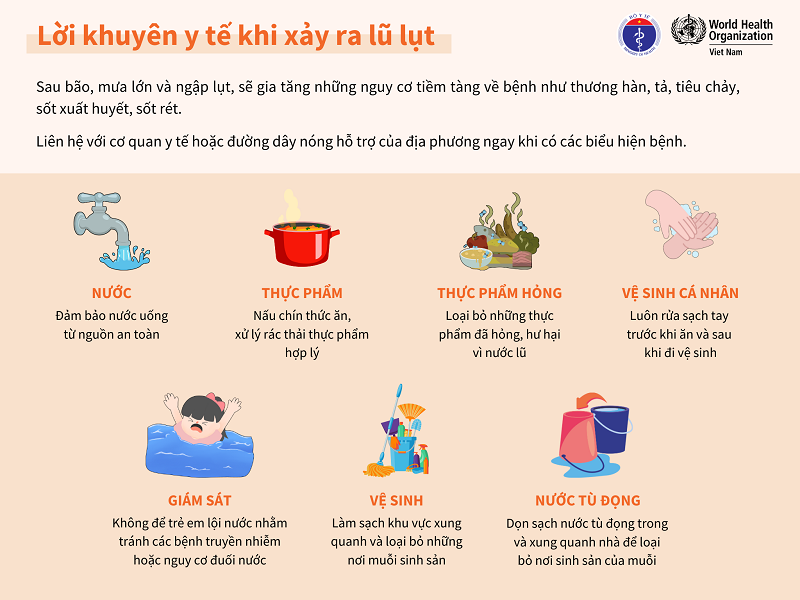 Trong và sau mưa bão, lũ lụt sẽ có rất nhiều vi sinh vật, bụi, rác, chất thải… theo dòng nước tràn ra nhiều nơi, gây ô nhiễm môi trường và tiềm ẩn nhiều nguy cơ dịch bệnh. Hơn nữa, mưa và ngập lụt là điều kiện thuận lợi để các loại vi khuẩn, vi rút và trung gian truyền bệnh sinh sôi phát triển và gây bệnh cho con người. Dưới đây là hướng dẫn cách phòng chống dịch bệnh của Bộ Y tế sau bão, lũ.
