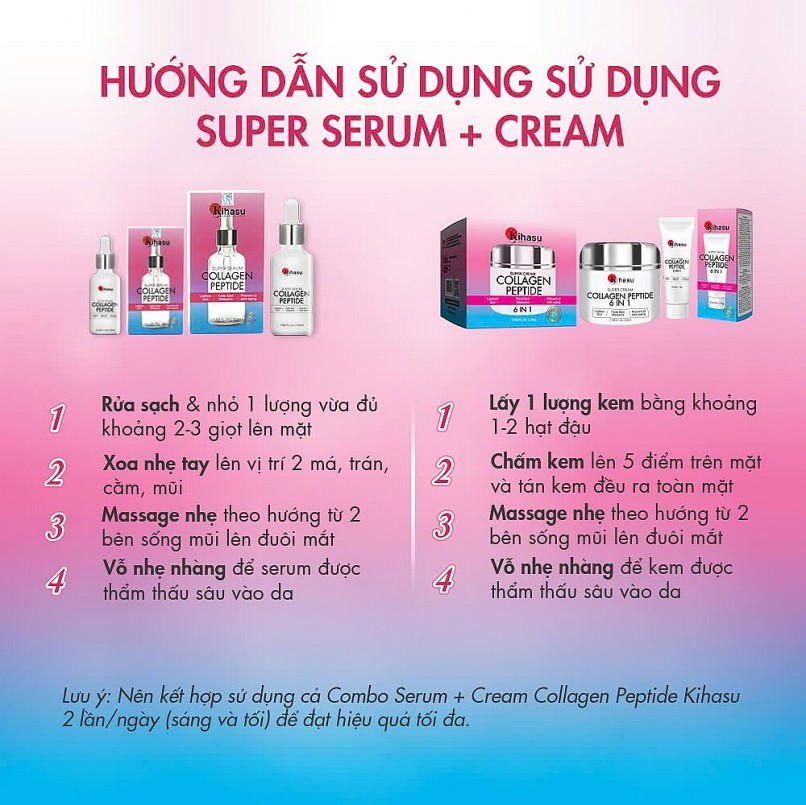 Không phải ngẫu nhiên mà bộ đôi này được các chuyên gia làm đẹp đánh giá cao. Sự kết hợp giữa Serum Collagen Kihasu và Kem Dưỡng Collagen Kihasu là chìa khóa mang lại hiệu quả gấp đôi: