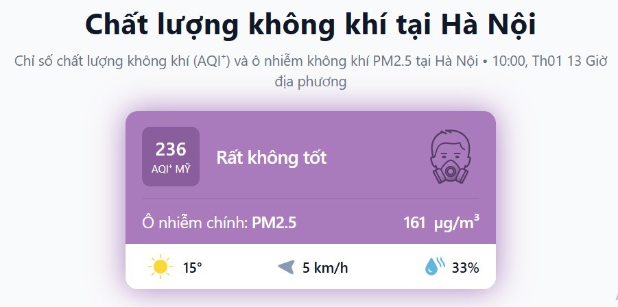 Theo hệ thống quan trắc không khí IQAir, vào lúc 8h04 sáng 13/1, với chỉ số chất lượng không khí AQI ở mức 236, Hà Nội lại một lần nữa đứng top đầu trong danh sách các thành phố ô nhiễm không khí nhất thế giới, với chất lượng không khí ở mức tím, mức “rất không tốt”…