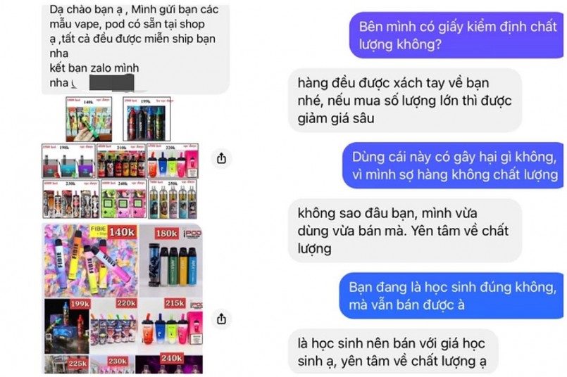 Tại một tài khoản cá nhân đăng bán thuốc lá điện tử, phóng viên vào vai người cần mua thuốc lá điện tử để dùng thử, được người bán hàng tư vấn: “Em bán có đầy đủ chủng loại, với mỗi loại sạc pin có công suất khác nhau, tinh dầu cũng có nhiều hương vị theo ý thích, trung bình từ 300.000 đồng đến 3 triệu đồng”.
