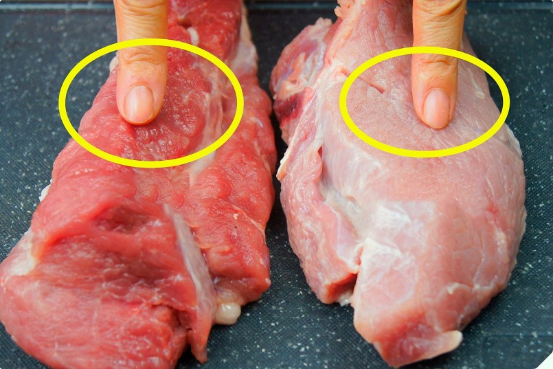 | Một trong những dấu hiệu quan trọng cần biết khi mua thịt lợn là độ đàn hồi, thớ thịt đàn hồi nhanh và có màu đỏ hồng chứng tỏ thịt tươi. |
