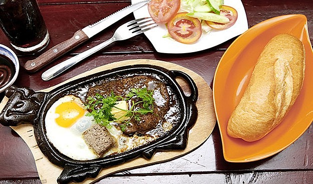 Bò bít tết kiểu Pháp: Nhờ đôi bàn tay khéo léo của người đầu bếp Pháp, bò bít tết nơi đây không chỉ ngon miệng mà còn trình bày rất đẹp mắt. Bò bít tết kiểu Pháp sẽ được rưới một loại nước sốt làm từ nhiều hương liệu, gia vị, thêm chút rượu vang. Thành phẩm sẽ ăn kèm salad, nhâm nhi với chút rượu.