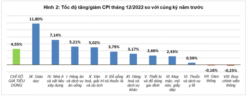 So với cùng kỳ năm trước, CPI tháng 12/2022 tăng 4,55%. Trong 11 nhóm hàng tiêu dùng chính có 9 nhóm tăng giá và 2 nhóm giảm giá.