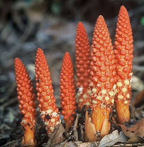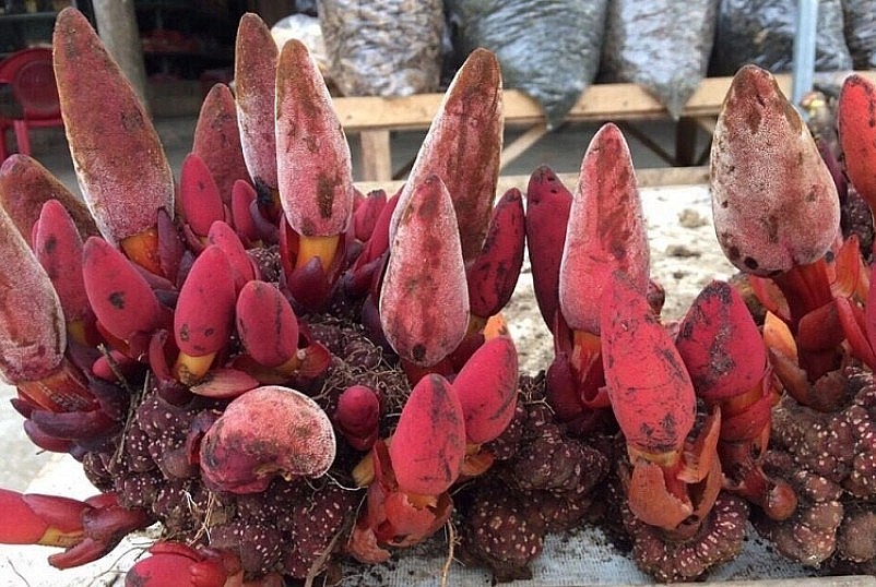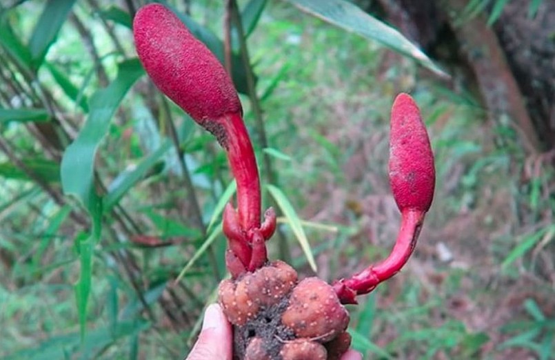 Nấm ngọc cẩu đực thân hình chóp, chiều dài từ 10 – 15cm nhưng cũng có khi dài hơn. Bên ngoài có màu đỏ nâu thẫm được tạo thành bởi vô số những cán hoa nhỏ li ti, có mo màu tím bao bọc bên ngoài, không mở bung ra. Loại nấm này sẽ có hương thơm dịu và mùi thơm nhiều hơn so với giống cái.