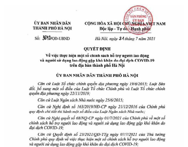 UBND thành phố Hà Nội vừa ban hành Quyết định số 3642/QĐ-UBND về việc thực hiện một số chính sách hỗ trợ người lao động và người sử dụng lao động gặp khó khăn do dịch Covid-19 trên địa bàn thành phố Hà Nội.