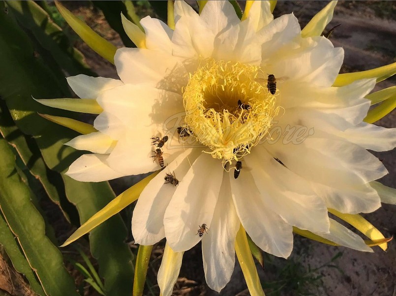 Hoa thanh long là loại hoa lưỡng tính, tương đối lớn, dài trung bình 25 -35 cm, nhiều lá đài và cánh hoa dính nhau thành ống. Có nhiều nhị đực với vòi nhị đài và một nhụy cái dài 18-24 cm, đường kính 5-8 mm, nuốm nhụy chia làm nhiều nhánh. Hoa thanh long mọc quanh cành, có mùi thơm. Hoa tự thụ phấn là chính, thường tập trung từ 3-5 ngày. Thời gian từ hoa nở đến quả chín khoảng 30-35 ngày.