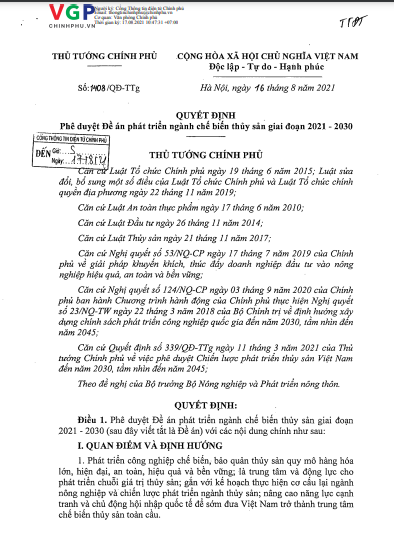 Thủ tướng Chính phủ vừa ban hành Quyết định số 1408/QĐ-TTg phê duyệt Đề án phát triển ngành chế biến thủy sản giai đoạn 2021-2030 nhằm phấn đấu đưa Việt Nam trở thành trung tâm chế biến thủy sản và đứng trong số 5 nước hàng đầu thế giới vào năm 2030.
