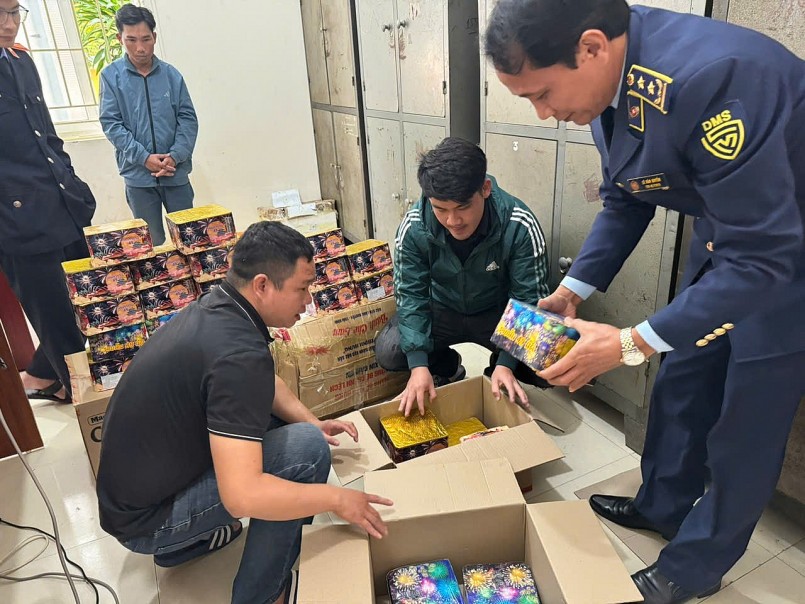 Qua kiểm tra, đoàn kiểm tra phát hiện sau yên xe mô tô có chứa 26 hộp pháo các loại do nước ngoài sản xuất, bên ngoài có hình ảnh pháo hoa nổ với tổng trọng lượng 44,5 kg. Tại thời điểm kiểm tra, chủ phương tiện không có giấy tờ, hóa đơn chứng từ hay hợp đồng chứng minh nguồn gốc hợp pháp của hàng hóa.