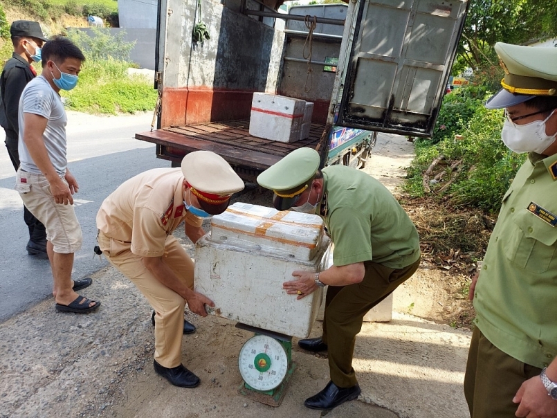 Đội Quản lý thị trường số 5 đã lập hồ sơ vụ việc, xử phạt vi phạm hành chính 10 triệu đồng đối với ông La Văn Coi về hành vi vận chuyển sản phẩm động vật không đảm bảo yêu cầu vệ sinh thú y và an toàn thực phẩm để kinh doanh. Đồng thời tổ chức phối hợp với các ngành chức năng tịch thu, thực hiện tiêu huỷ toàn bộ số hàng vi phạm theo quy định pháp luật.