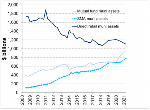 | Số liệu của Citi Research và Cục Dự Trữ Liên Bang Mỹ cho thấy dòng tiền đổ vào sản phẩm ủy thác đầu tư đã tăng hơn 7 lần trong giai đoạn 2008 - 2021 |