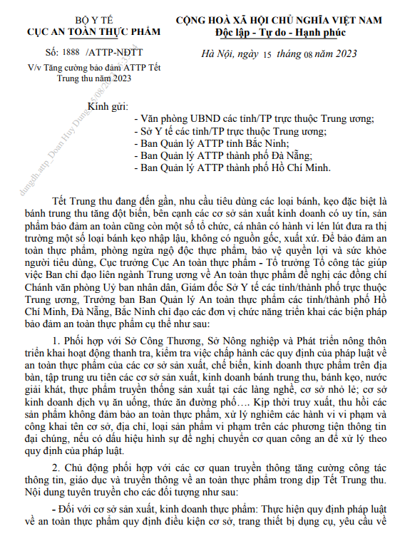 | Công văn số 1888/ATTP-NĐTT đề nghị các đơn vị tăng cường bảo đảm an toàn thực phẩm tết Trung thu năm 2023 |