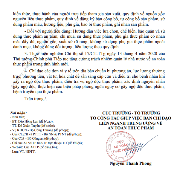 Cụ thể, ngày 15/8/2023, Cục trưởng Cục An toàn thực phẩm - Tổ trưởng Tổ công tác giúp việc Ban chỉ đạo liên ngành Trung ương về An toàn thực phẩm vừa ban hành công văn số 1888/ATTP-NĐTT đề nghị các đồng chí Chánh văn phòng Uỷ ban nhân dân, Giám đốc Sở Y tế các tỉnh/thành phố trực thuộc Trung ương, Trưởng ban Ban Quản lý An toàn thực phẩm các tỉnh/thành phố Hồ Chí Minh, Đà Nẵng, Bắc Ninh chỉ đạo các đơn vị chức năng triển khai các biện pháp bảo đảm an toàn thực phẩm cụ thể như sau: