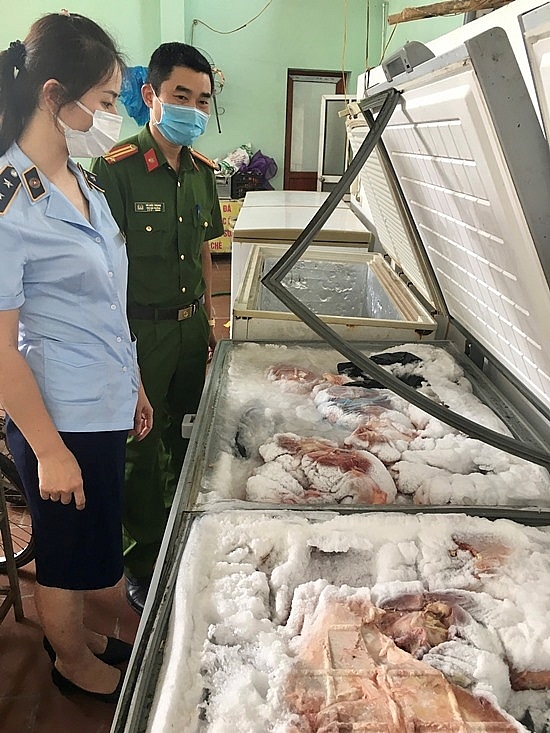 Quá trình kiểm tra, Đoàn kiểm tra phát hiện 02 con lợn thịt (khoảng 60kg/con) đã chết, trên thân lợn có nhiều vết bầm tím, nổi ban, có dấu hiệu mắc bệnh. Ngoài ra, tại hộ kinh doanh đang tập kết 1.000kg sản phẩm động vật là thịt lợn đã bị biến đổi mầu sắc đen xám, bốc mùi hôi thối nghi ngờ là sản phẩm thịt lợn mắc bệnh, đang được lưu giữ, bảo quản trong 07 tủ bảo ôn.