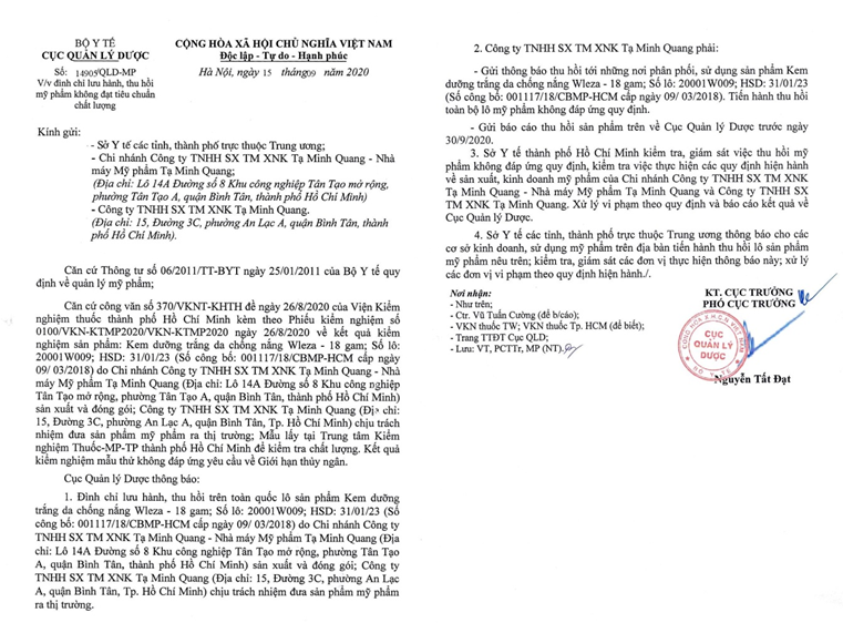 Theo đó , Cục Quản lý Dược (Bộ Y tế) ra văn bản số 14905/QLD-MP ngày 15/9/2020, đình chỉ lưu hành, thu hồi trên toàn quốc đối với sản phẩm mỹ phẩm Kem dưỡng trắng da chống nắng Wleza - hộp 18gram (Số lô: 20001W; HSD: 31/01/2023) do Chi nhánh Công ty TNHH SX TM XNK Tạ Minh Quang - Nhà máy Mỹ phẩm Tạ Minh Quang (địa chỉ: Lô 14A đường số 8 Khu công nghiệp Tân Tạo mở rộng, p. Tân Tạo A, Q. Bình Tân, Tp. Hồ Chí Minh) sản xuất và đóng gói và