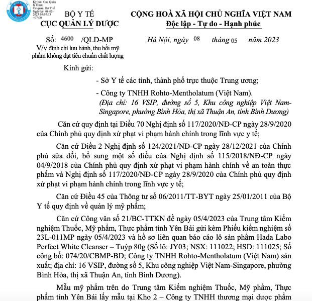 Cụ thể, căn cứ Công văn số 21/BC-TTKN đề ngày 05/4/2023 của Trung tâm Kiểm nghiệm Thuốc, Mỹ phẩm, Thực phẩm tỉnh Yên Bái gửi kèm Phiếu kiểm nghiệm số 23L-011MP ngày 05/4/2023 và hồ sơ liên quan báo cáo lô sản phẩm Hada Labo Perfect White Cleanser – Tuýp 80g (Số lô: JY03; NSX: 111022; HSD: 111025; Số công bố: 074/20/CBMP-BD; Công ty TNHH Rohto-Mentholatum sản xuất; địa chỉ: 16 VSIP, đường số 5, Khu công nghiệp Việt Nam-Singapore, phường Bình Hòa, thị xã Thuận An, tỉnh Bình Dương).