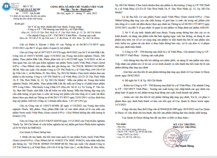 Tại Công văn số 13528/ QLD-MP ngày 23/12/2022 của Cục Quản lý dược cho biết, theo báo cáo kết quả kiểm nghiệm sản phẩm Nước muối Vĩnh Phúc (Natri clorid 0,9%) - Chai 500ml (Số lô: 010622 275; HSD: 010625); trên nhãn mẫu thử ghi thông tin: "Số TNCB: 005065/19/CBMP-HCM; Nhà sản xuất: Chi nhánh Công ty CP TM Thiết bị y tế Vĩnh Phúc (59/13E-F-H ấp Tiến Lân 1, xã Bà Điểm, huyện Hóc Môn, TP. Hồ Chí Minh); chịu trách nhiệm đưa sản phẩm ra thị trường: Công ty CP TM Thiết bị y tế Vĩnh Phúc (23/23-25 Tân Thới Nhất 18, P. Tân Thới Nhất, Q. 12, TP. Hồ Chí Minh)".