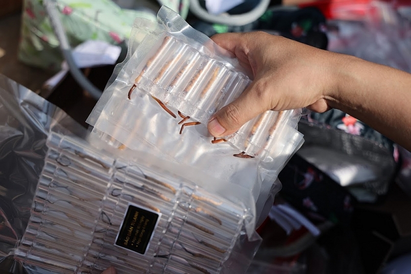 Tại đây, lực lượng chức năng phát hiện 36 vỉ đông trùng hạ thảo. Mỗi vỉ chứa 10 con đông trùng hạ thảo được hút chân không, cùng một lượng lớn đựng trong hộp nhựa và túi bóng với tổng số lượng 480 con. Tất cả đều không có nhãn mác, bao bì sản phẩm, công dụng cũng như hướng dẫn sử dụng. Cách phân biệt duy nhất chỉ có dòng chữ được viết tay trên các vỉ hút chân không với nội dung "VIP" để phân biệt với các sản phẩm còn lại.