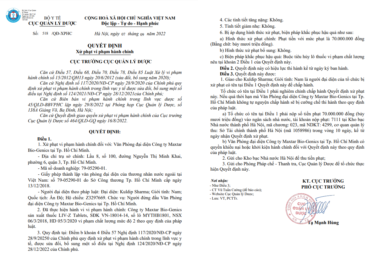 Cụ thể, Cục Quản lý Dược đã ký Quyết định số 518/QĐ-XPHC xử phạt vi phạm hành chính đối với Văn phòng đại diện Công ty Maxtar Bio-Genics (địa chỉ số 100, đường Nguyễn Thị Minh Khai, phường 6, quận 3, TPHCM).