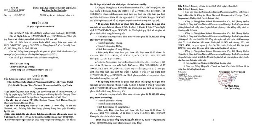 Cụ thể, ngày 7/6/2021 Cục Quản lý Dược ban hành Quyết định số 339/QĐ-XPHC về việc xử phạt vi phạm hành chính Công ty Zhangjiakou Kaiwei Pharmaceutical Co., Ltd (Trung Quốc) (Đại diện là Công ty China National Pharmaceutical Foreign Trade Corporation).