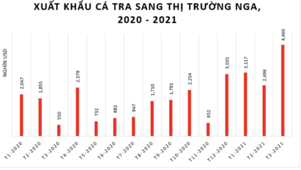 Theo Hiệp hội Chế biến và Xuất khẩu Thủy sản (VASEP), tính đến nửa đầu tháng 4/2021, tổng giá trị xuất khẩu cá tra sang thị trường Nga đạt 11,4 triệu USD, tăng 118,7% so với cùng kỳ năm trước.