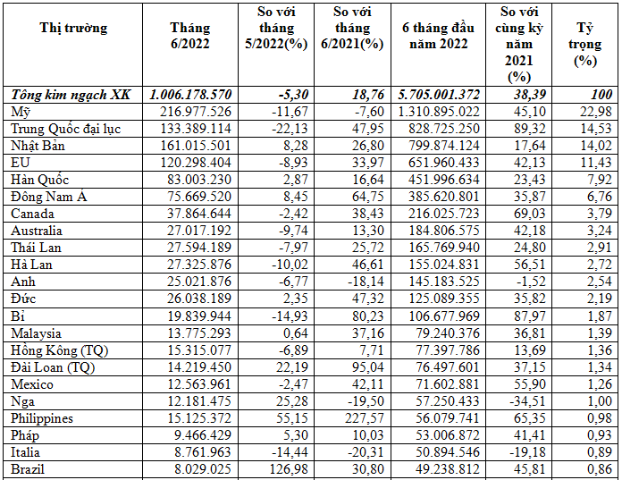 Về thị trường, Mỹ là thị trường duy nhất đạt trên tỷ USD trong 6 tháng đầu năm, chiếm 23% trong tổng kim ngạch xuất khẩu nhóm hàng này của cả nước, đạt 1,31 tỷ USD, tăng mạnh 45,1% so với cùng kỳ năm 2021; trong đó riêng tháng 6/2022 đạt 216,98 triệu USD, giảm 11,7% so với tháng 5/2022 và giảm 7,6% so với tháng 6/2021.